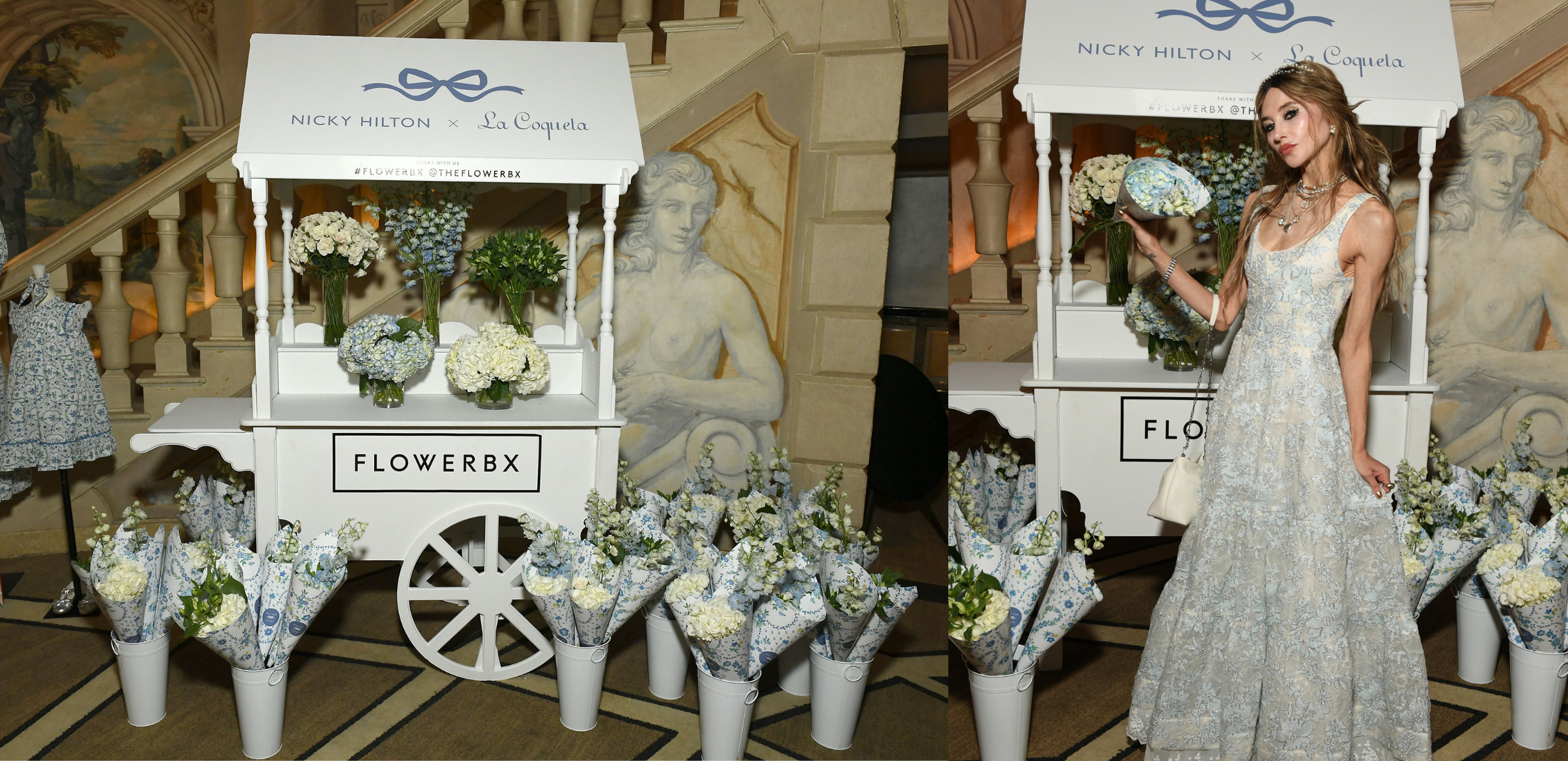 Enhancing the experience, FLOWERBX introduced their much-loved floral cart, overflowing with hydrangeas, periwinkle delphinium, snow white alstroemeria and white roses, beautifully complementing Nicky’s signature powder blue and white palette. Each guest was invited to take home a small bouquet, delicately wrapped in blue bow floral print paper - a considered touch that felt both personal and entirely in keeping with the collection’s aesthetic. The print itself features as one of the collection’s exclusives, adorning the Lily Grace dress, baby set and co-ordinating womenswear London dress.