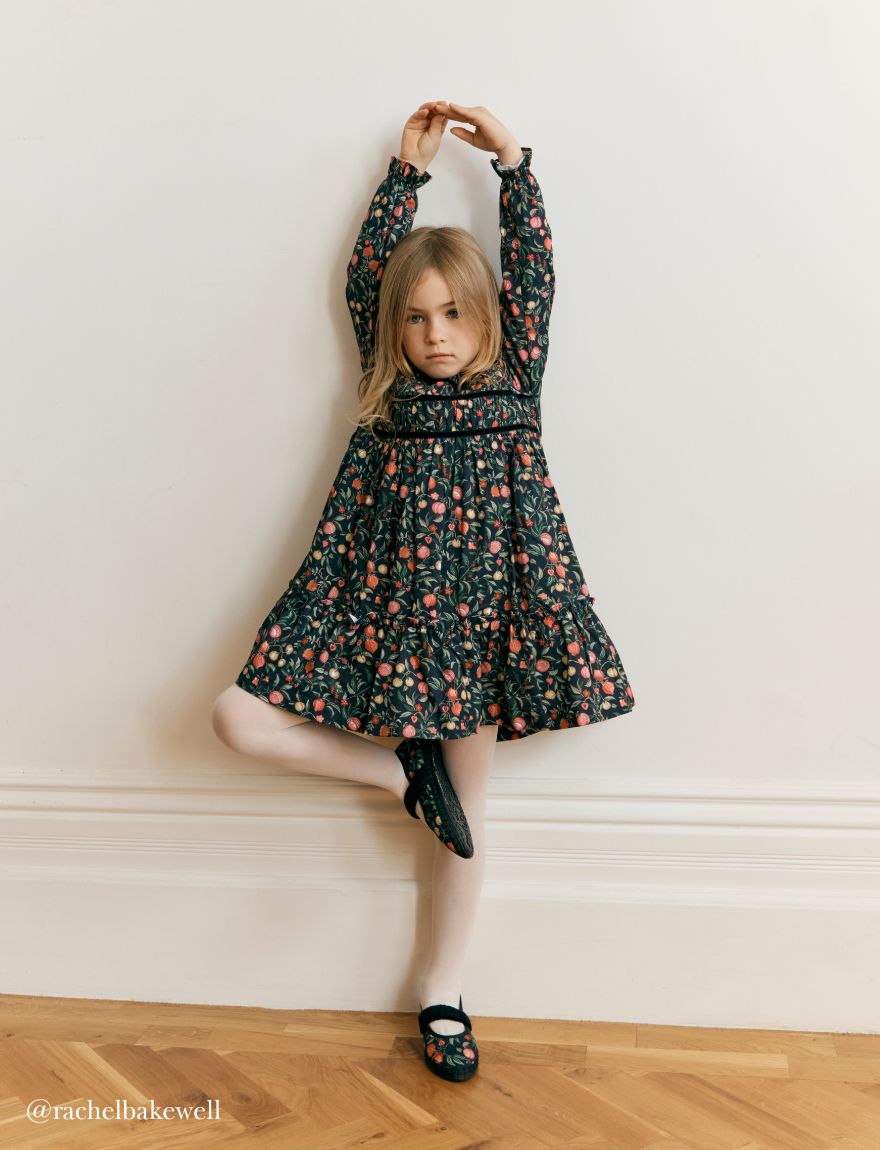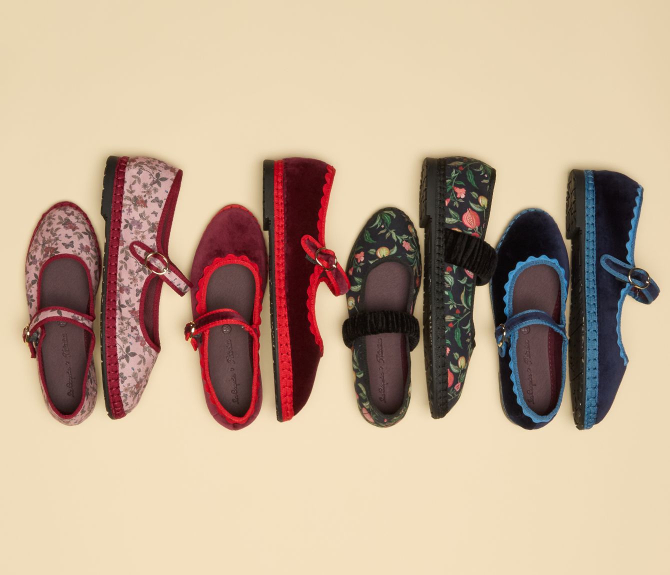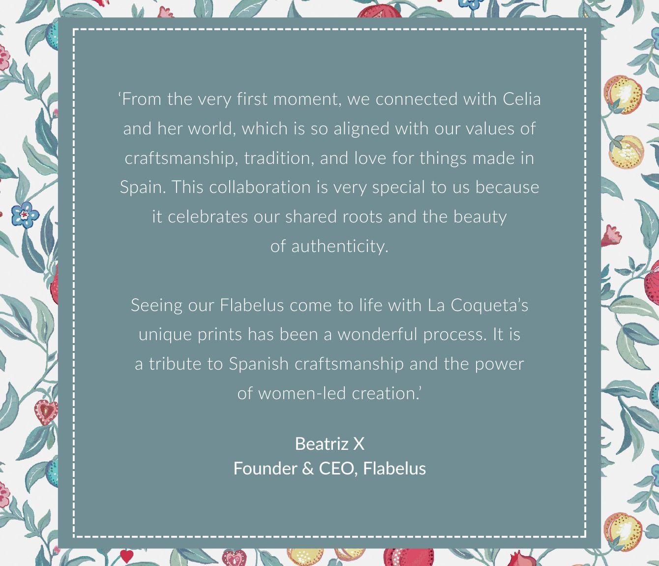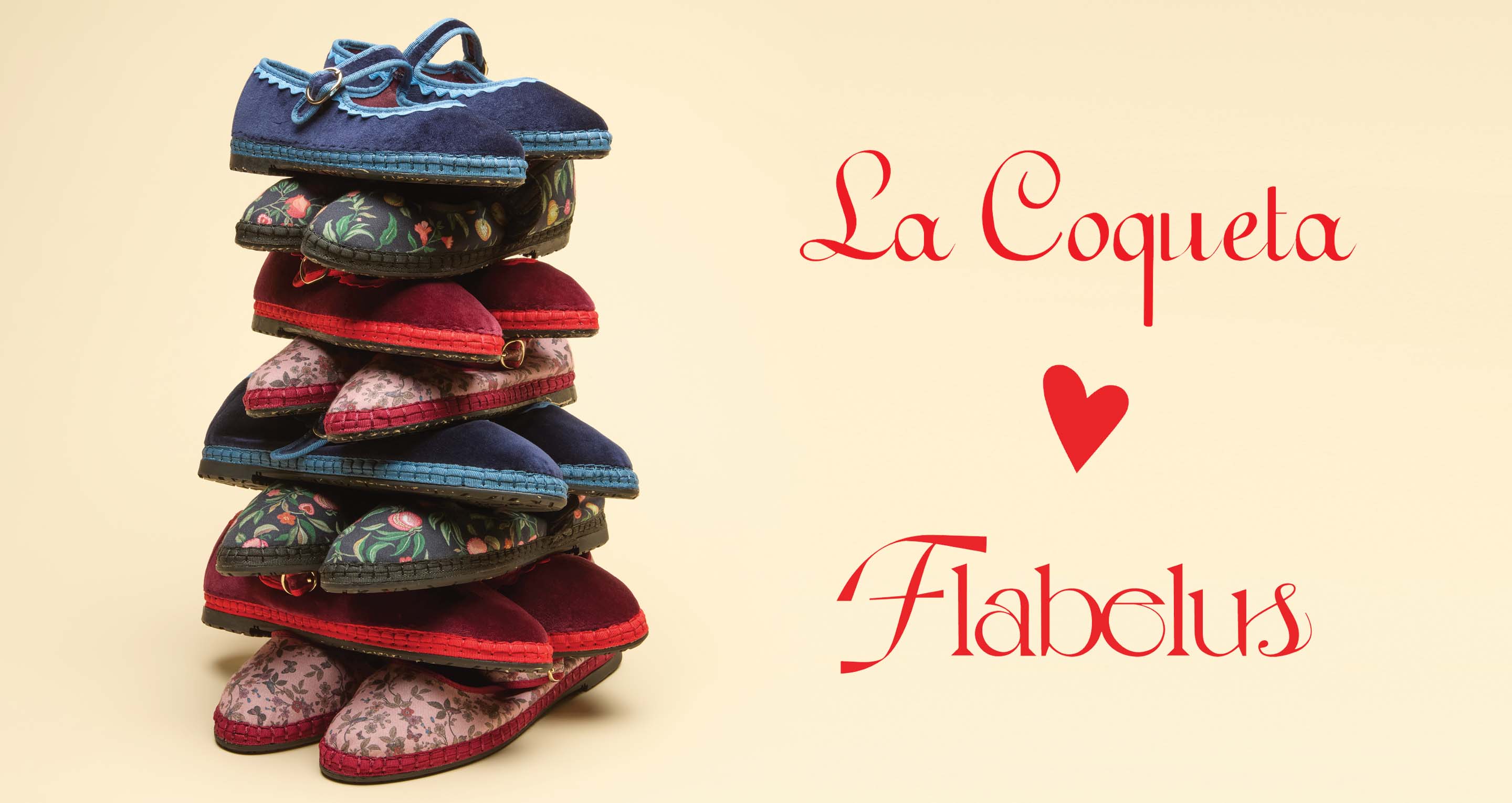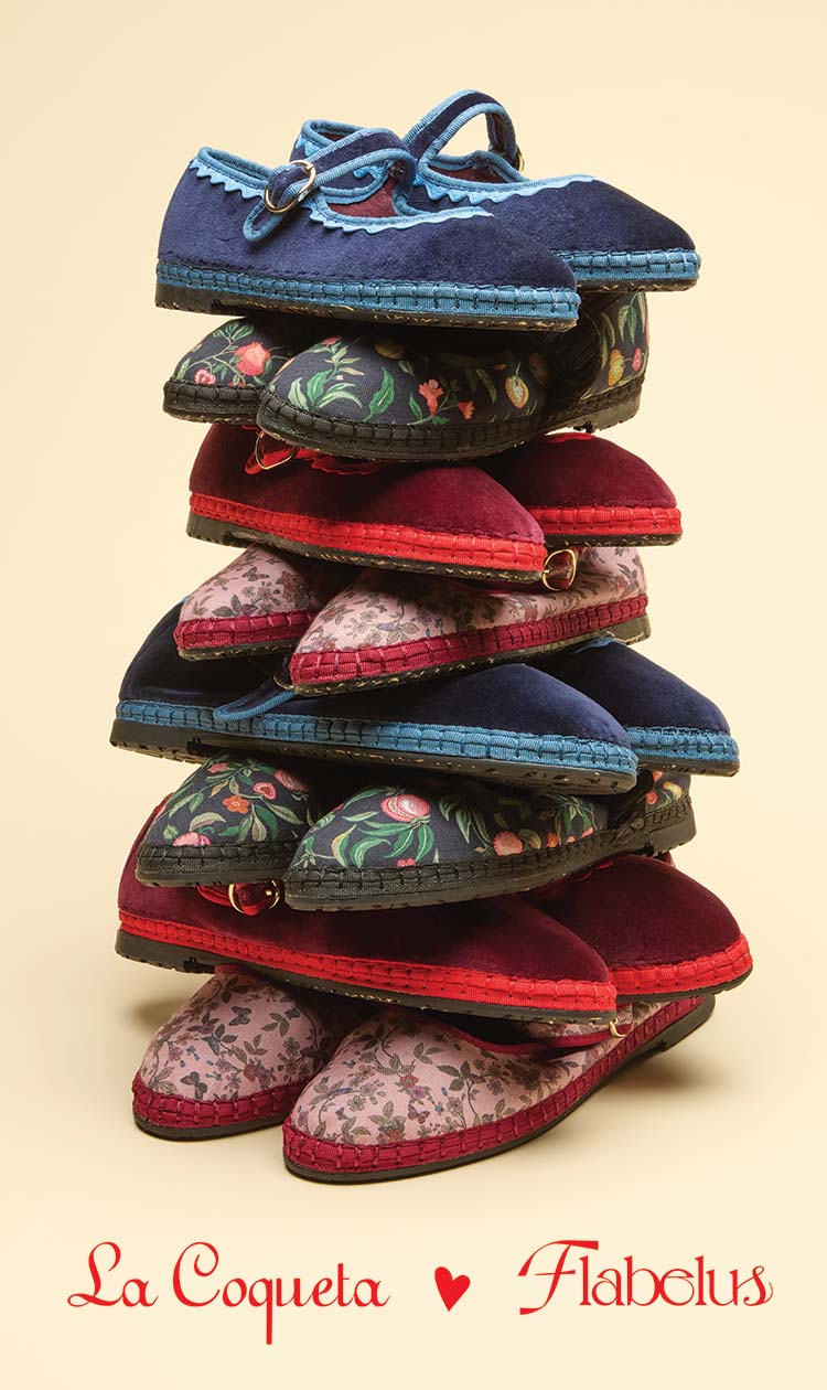 The collection reimagines Flabelus’ most iconic styles in La Coqueta’s exclusive prints. Think jewel-toned velvets, hand-painted pomegranates, and whimsical florals, all lovingly handmade by Spanish artisans.