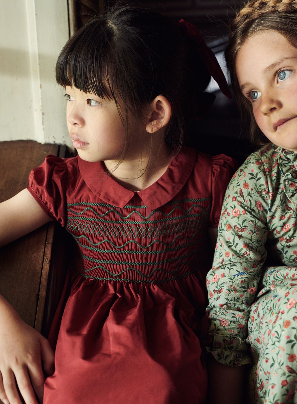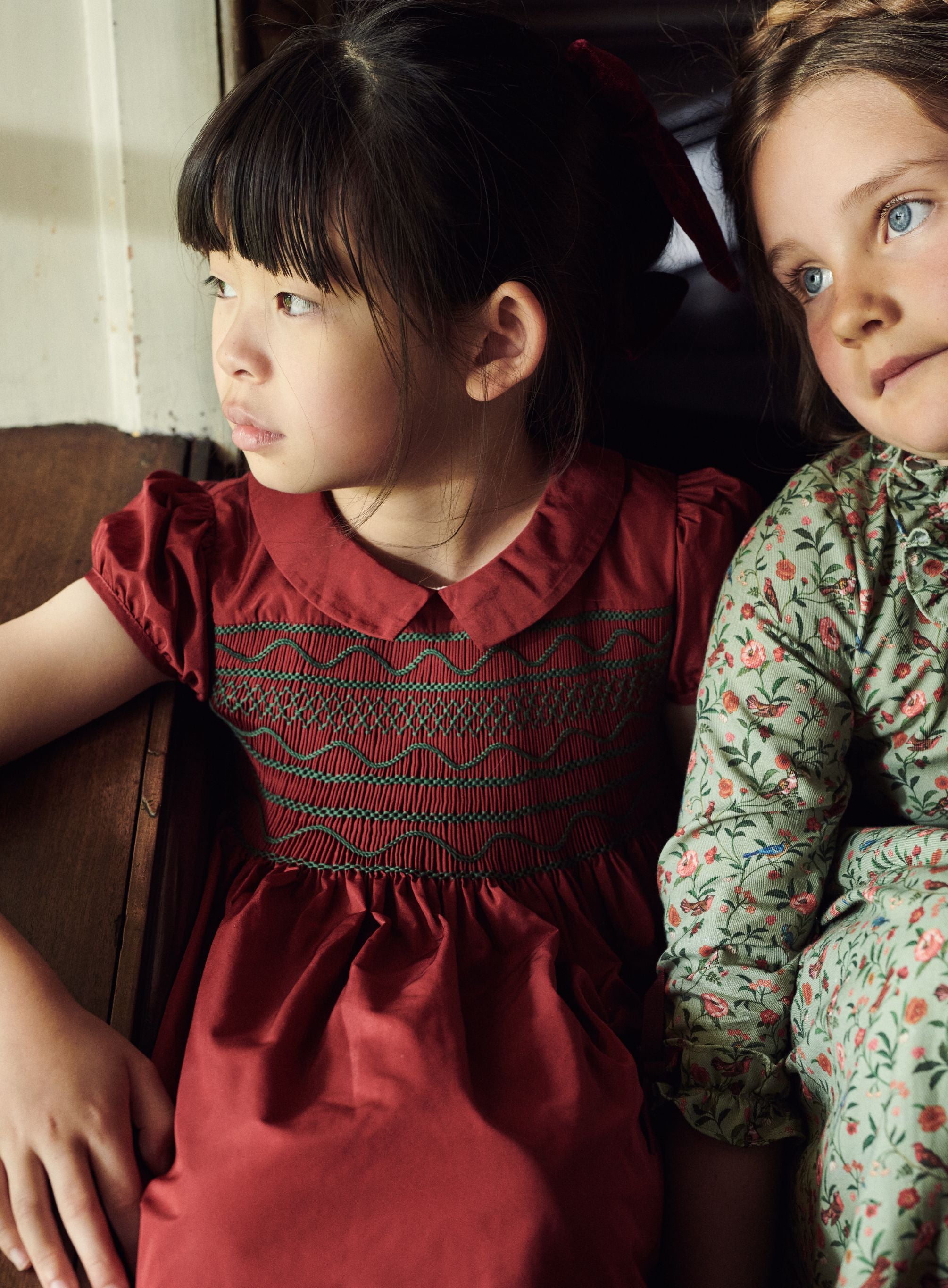 Feminine, floral designs are adorned with intricate honeycomb smocking and contrasting embroidery for a timeless touch.