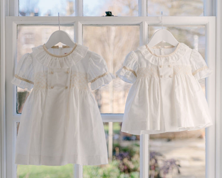 Coordinate your bridal party with matching toddler and baby outfits from our Special Occasion range available in Baby Sets for newborn babies and Girl Dresses ranging to 10Y. La Coqueta's Santina Smock Girl Dress matches perfectly with the Santina Smock Baby Set and Santina Smock Baby Romper, ensuring your bridesmaids and pageboys truly look the part.