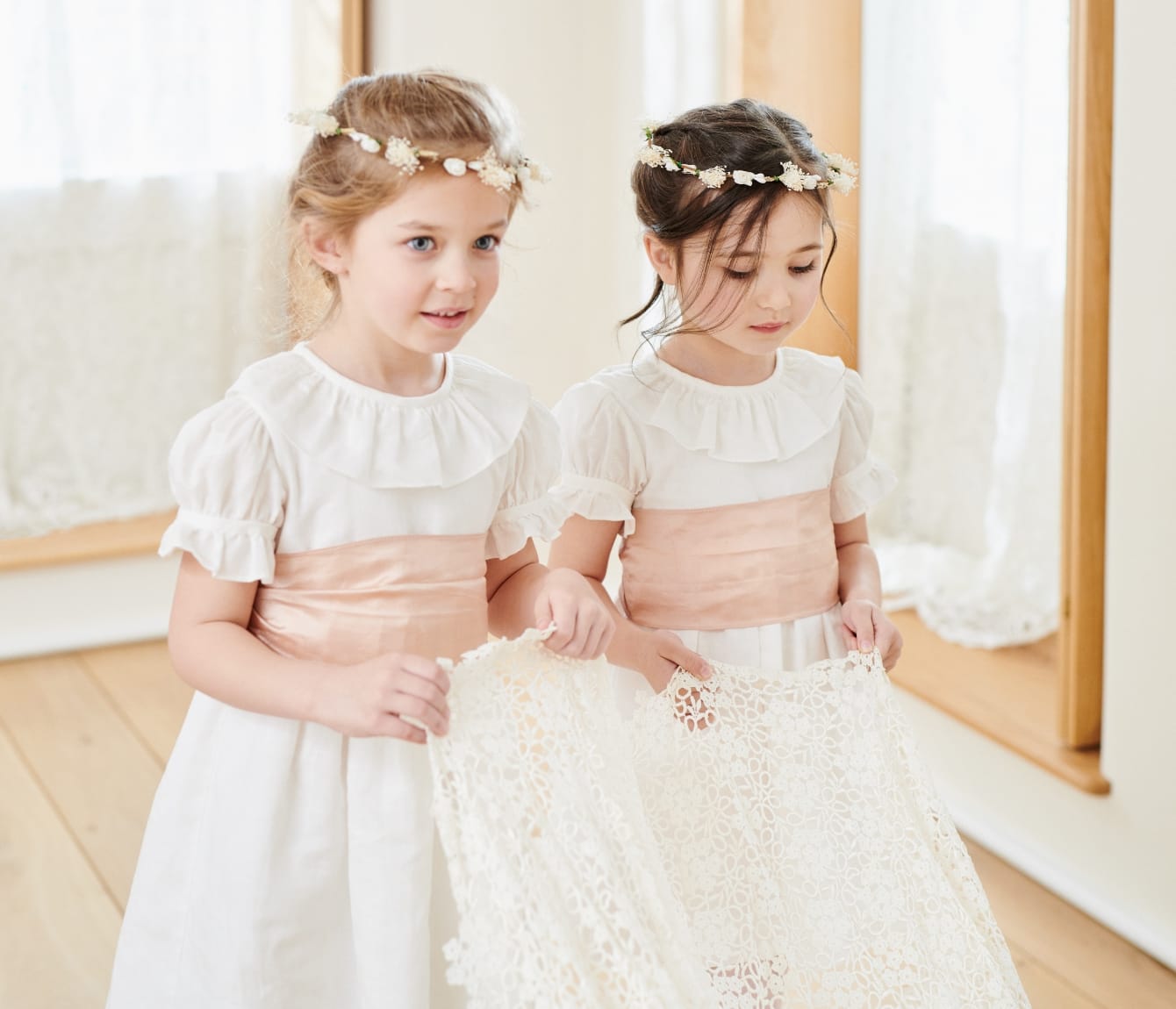 Standout pieces for flower girl wedding outfits include the Luisa Ceremony Girl Dress, a traditional ivory fit-and-flare piece crafted from an airy linen-cotton blend.