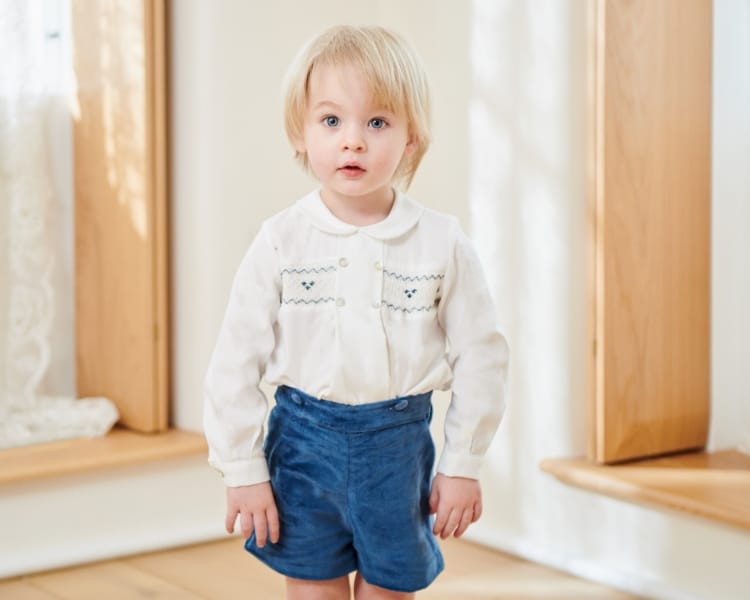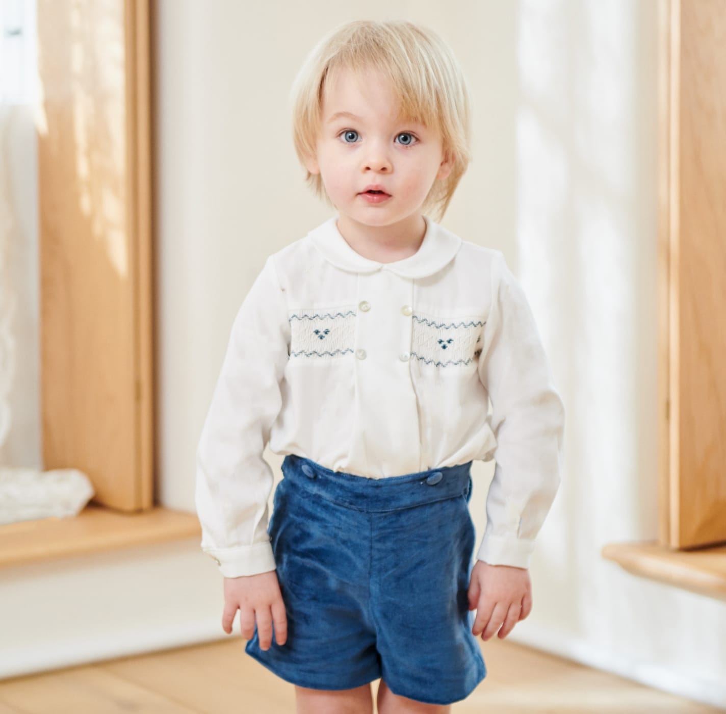 Or, for an adorable baby boy wedding outfit for colder climates, choose La Coqueta's Virgilio Smock Ceremony Baby Boy Set for your son's next special event. Crafted from the finest 100% cotton that ensures your little one keeps comfortable on the big day, this timeless silhouette features a long sleeve ivory shirt and attached bloomers in rich blue velvet, with artisanal hand-smocked embroidery and flashes of deep blue contrasting thread.