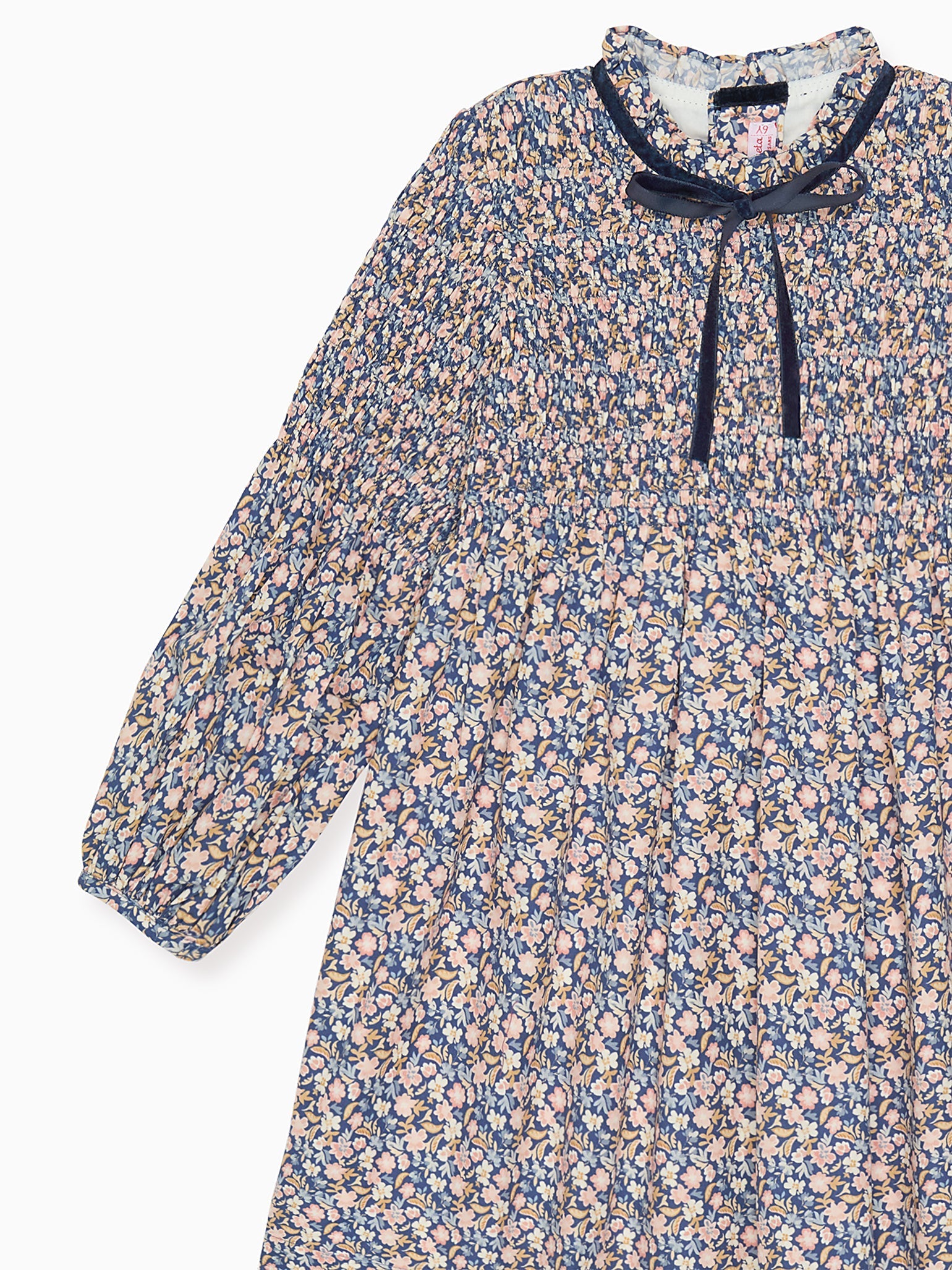 Flowing, vintage-inspired silhouettes are the signature of La Coqueta's aesthetic, and the Raya Girl Smocked Dress is a perfect example. It's made from luxuriously soft pure cotton, which feels light and looks so elegant, decorated with a charming ditsy floral pattern exclusive to La Coqueta, in delicious hues of soft pink, blue and green on an ivory base. It has long blouson sleeves, shirred shoulders and a bodice that is artfully crafted by artisans in Spain that flows through to a floaty, relaxed skirt that swishes beautifully with every move. The delicately pleated stand collar is finished with a whimsical navy velvet self-tie bow around the neck; a testament to La Coqueta's love for attention to detail and craftsmanship. It fastens at the back with a signature mother of pearl button placket and is fully lined in pure cotton for extra comfort and coverage. Pair it with the matching Girl Soft Ribbon Bow Clip, and coordinate with a little sister wearing the Raya Baby Girl Smocked Set for those adorable, perfect-picture moments.