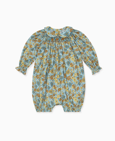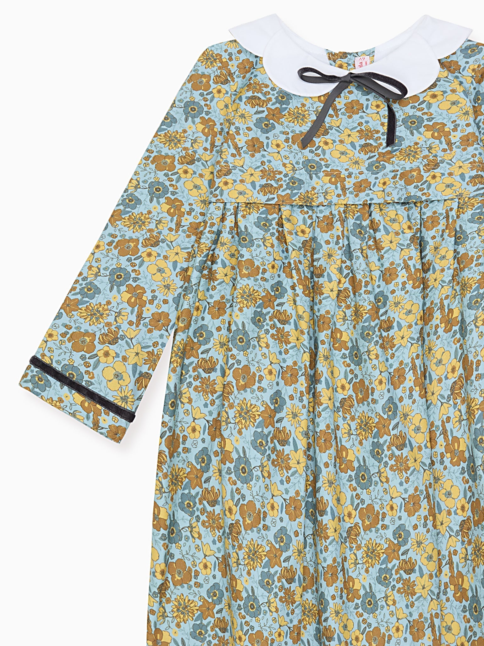 Heritage is at the heart of La Coqueta, with Founder and Creative Director Celia Muñoz's designs developing from her Spanish roots and the traditional clothing she grew up in. Known for rich embroideries and hand smocking, heavy collars, and decorative details, every collection manifests in elaborate yet elegant designs. The Ruby Girl Dress is a beautiful example of this, crafted from decadent cotton and crafted in a traditional longer-length fit-and-flare silhouette that offers an airy, relaxed feel, enhanced by long sleeves. The standout feature is the stunning layered white cotton scallop collar, delicately finished with a black velvet self-tie bow around the neck, adding a playful yet refined touch. It fastens with a mother of pearl button placket at the back and is fully lined in pure cotton for added comfort, with a delicate pleated finish around the waistband for an effortlessly feminine touch. Inspired by vintage botanical illustrations, delicate floral motifs were first hand-rendered in fine detail before being digitally refined and printed in Spain in small runs of fabric. The result is a soft, painterly retro pattern in soft blue and yellow hues, perfectly complementing the feminine details. Coordinate with a little sister wearing the Palma Baby Girl Romper for those adorable perfect-picture moments.