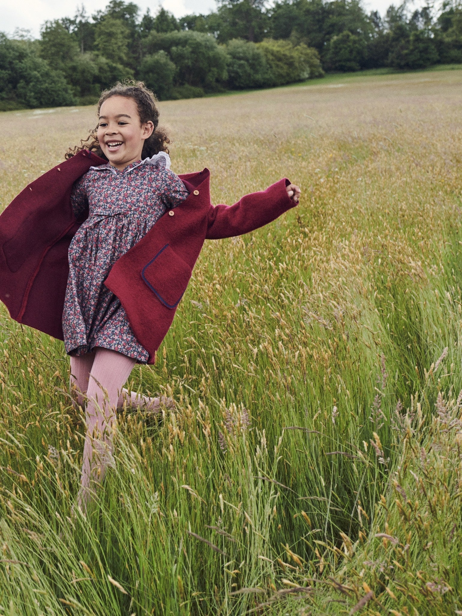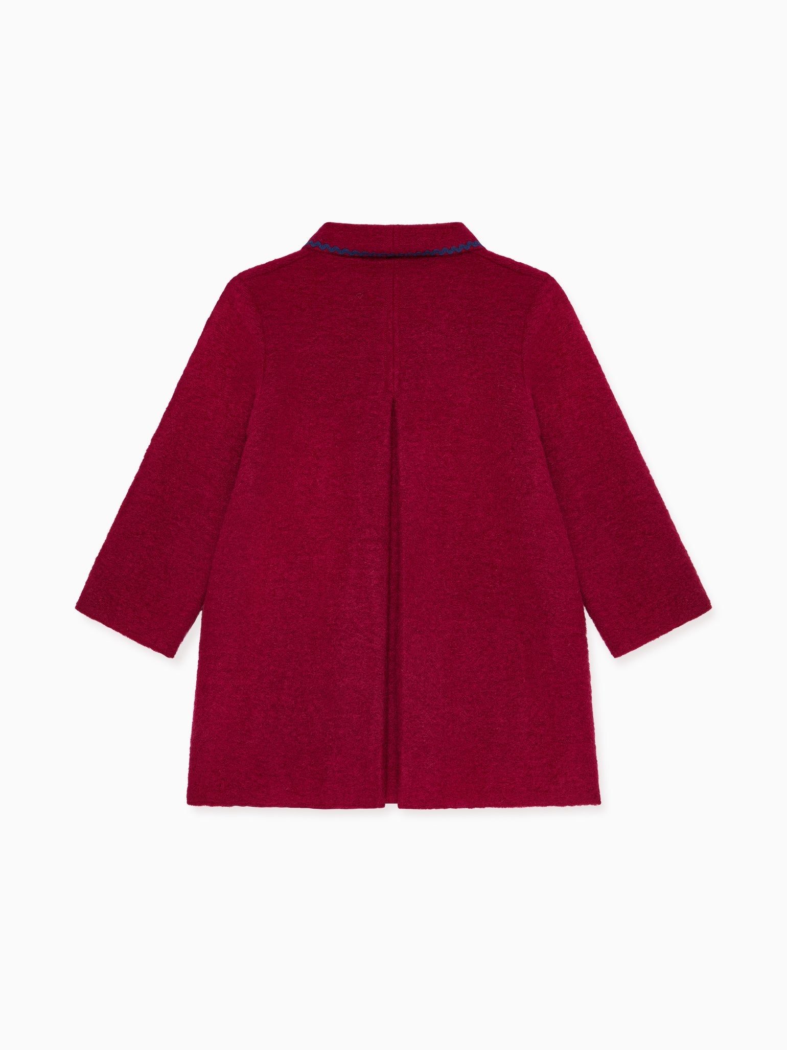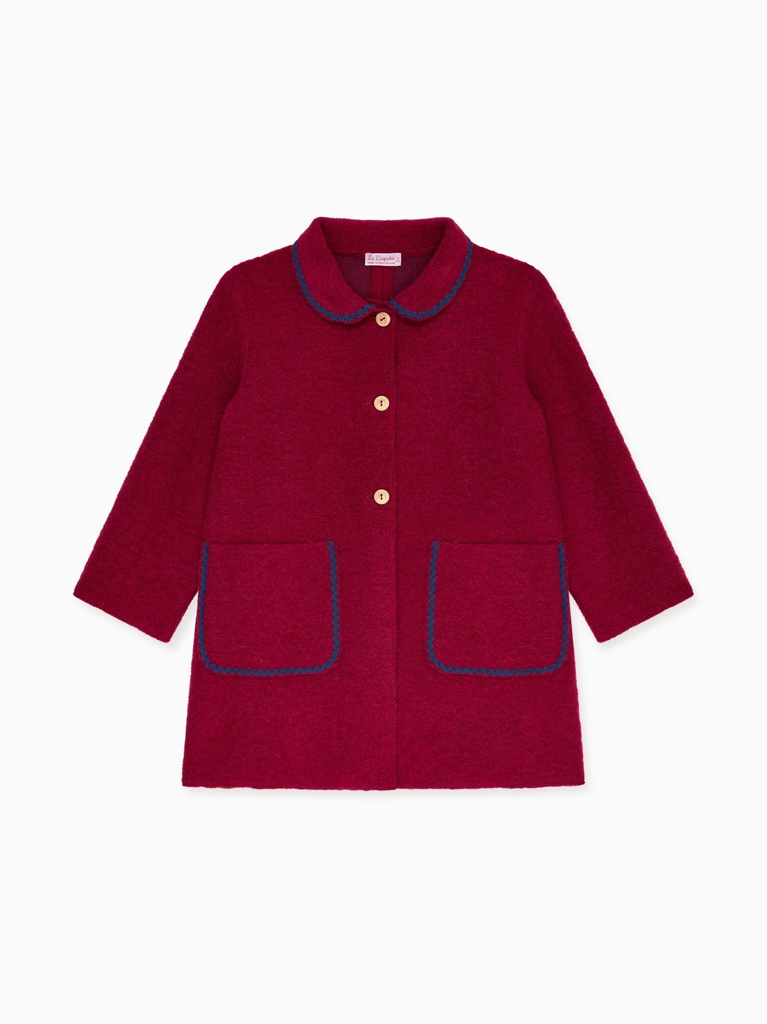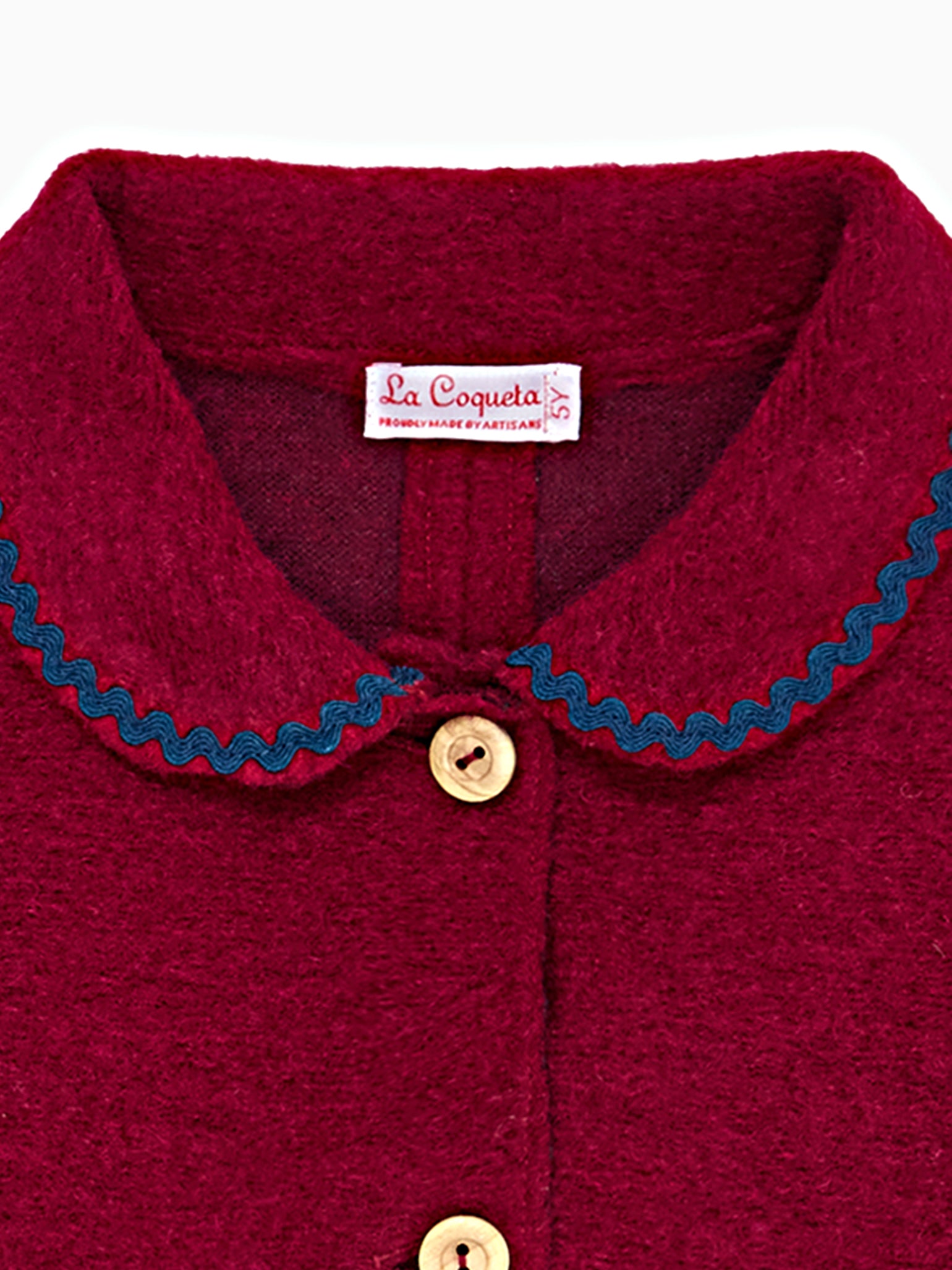 Celia Muñoz and the La Coqueta team design our Spanish girl's clothing collections with versatility in mind, ensuring each silhouette is a testament to our love for attention to detail and guarantees plenty of wear. Every shape is effortlessly refined over the years, tailoring each piece to ensure countless wears all season long. The Henrietta Girl Coat is no exception to the rule. It is crafted in Spain from a luxurious blend of wool that is lightweight, breathable, and kind to even the most delicate skin. It has an elegant fit and flare silhouette, marrying practicality with effortless luxury. Rendered in a versatile shade of burgundy with contrasting navy ric rac trims, it has long sleeves, patch pockets at the front, handcrafted wooden buttons to fasten, and a tailored vent at the back. Unlined and lightweight, it is finished with a signature Peter Pan collar in true La Coqueta style and drapes effortlessly.