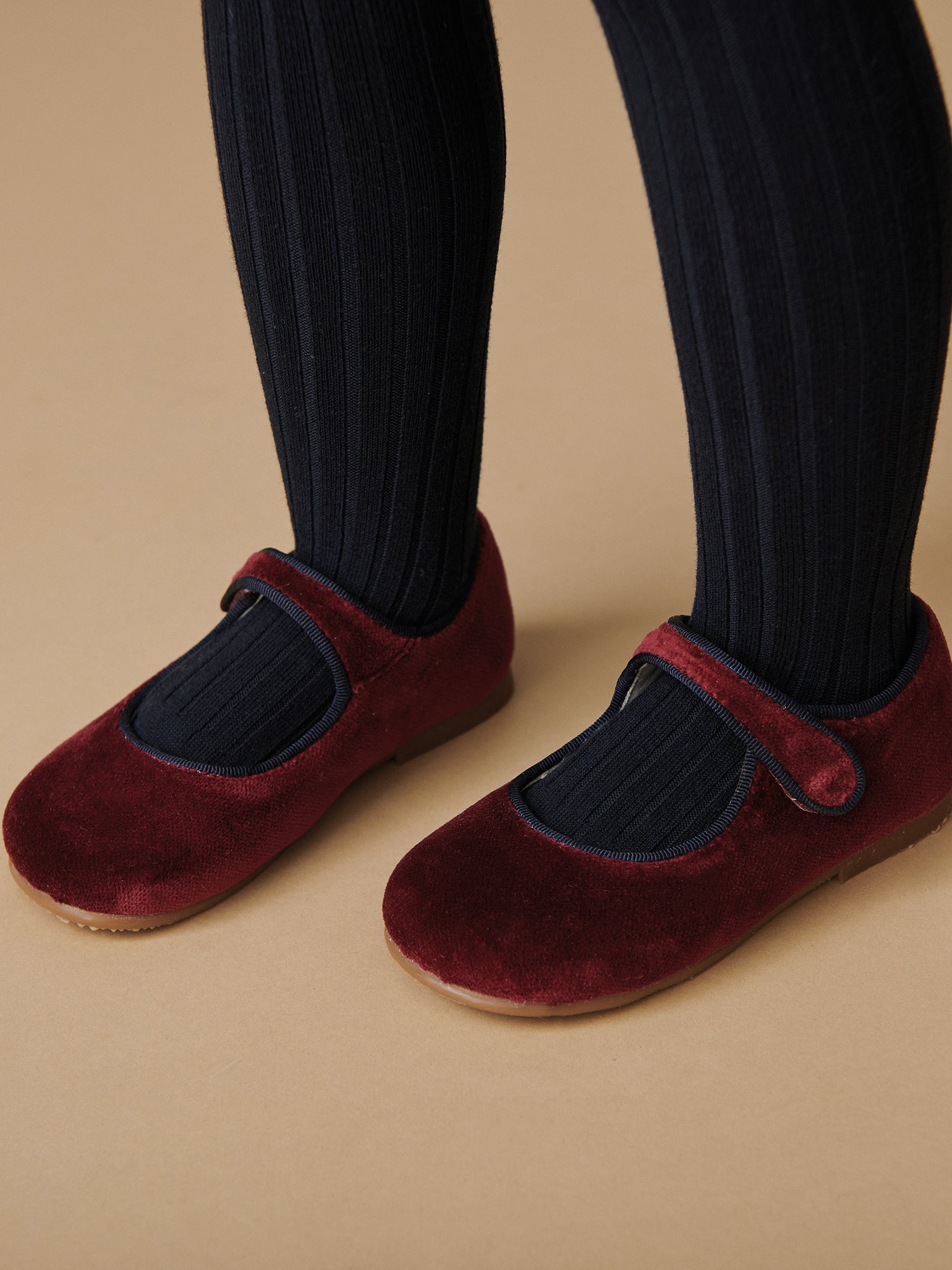 La Coqueta's exquisite designs are inspired by the traditional styles Founder and Creative Director Celia Muñoz grew up wearing in her native Granada. Handmade in Spain from luxurious cotton velvet, the Velvet Girl Mary Jane Shoes are the perfect choice for seasonal events and special celebrations. They fasten with a velcro strap, and have contrasting grosgrain trims in navy blue, with a lightly padded rubber sole with a slight heel that ensures total comfort all day and night. This version comes in a rich shade of burgundy red that was designed with the festive party season in mind.