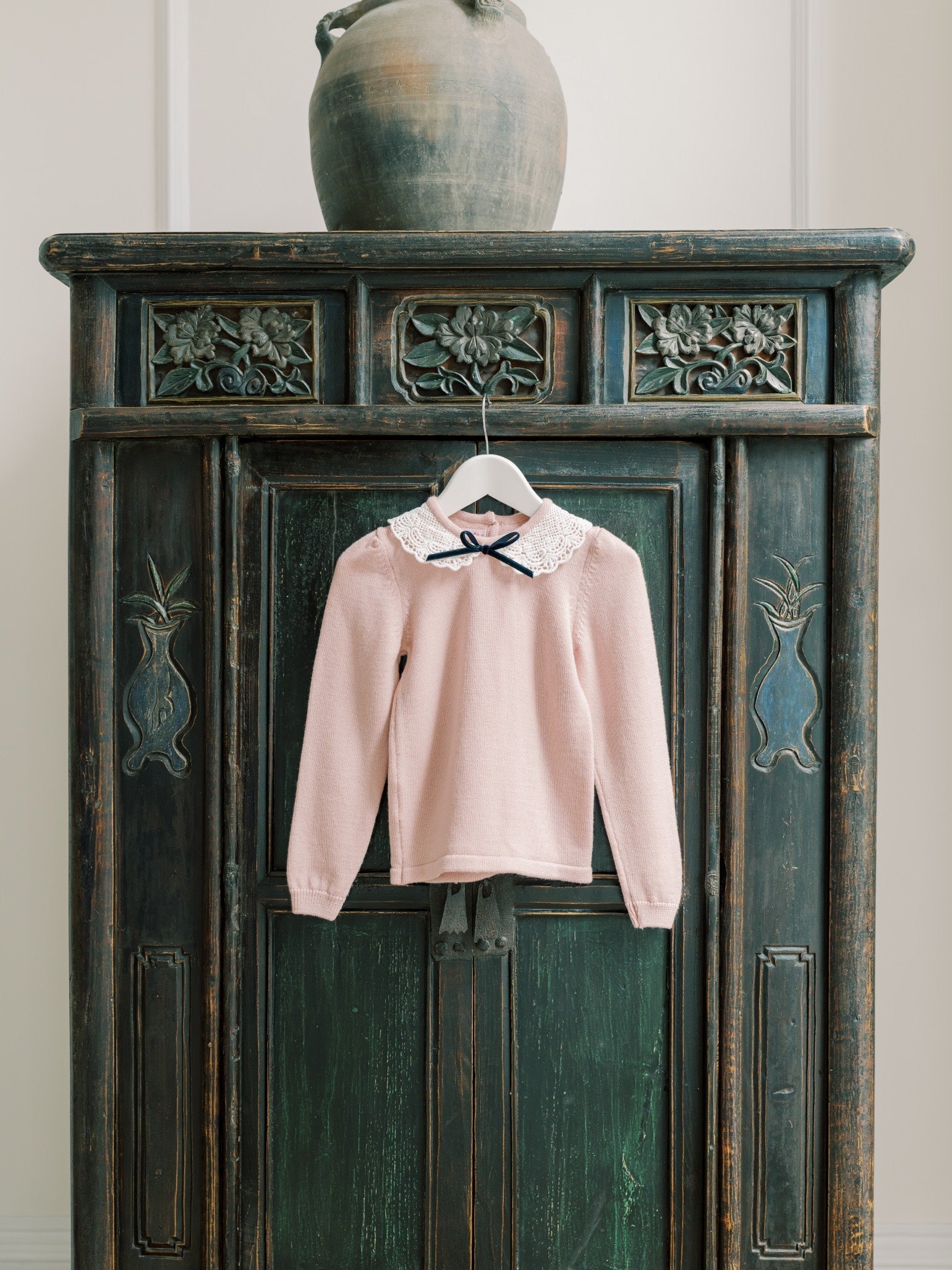 Celia Muñoz and the La Coqueta team are dedicated to crafting dependable wardrobe staples that promise endless wear in colder climates. The Blanca Merino Girl Jumper exemplifies this commitment, offering effortless style and versatility throughout the season. This captivating dusty pink jumper is intricately knitted from pure Merino wool, ensuring an exceptionally soft handle that is gentle on even the most delicate skin. It is adorned with a decadent lace collar and a black velvet bow at the neck, featuring long sleeves and dropped shoulders for a relaxed yet refined silhouette. Adding to its charm, this girl's jumper is finished with chunky ribbed trims on the hem and cuffs, with buttons for easy fastening at the back.
