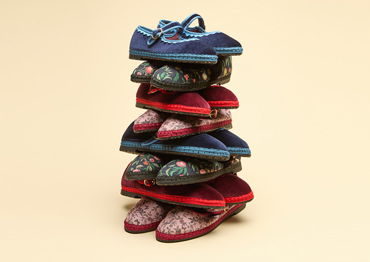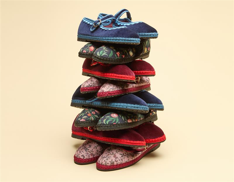 The collection reimagines Flabelus’ most iconic styles in La Coqueta’s exclusive prints. Think jewel-toned velvets, hand-painted pomegranates, and whimsical florals, all lovingly handmade by Spanish artisans.