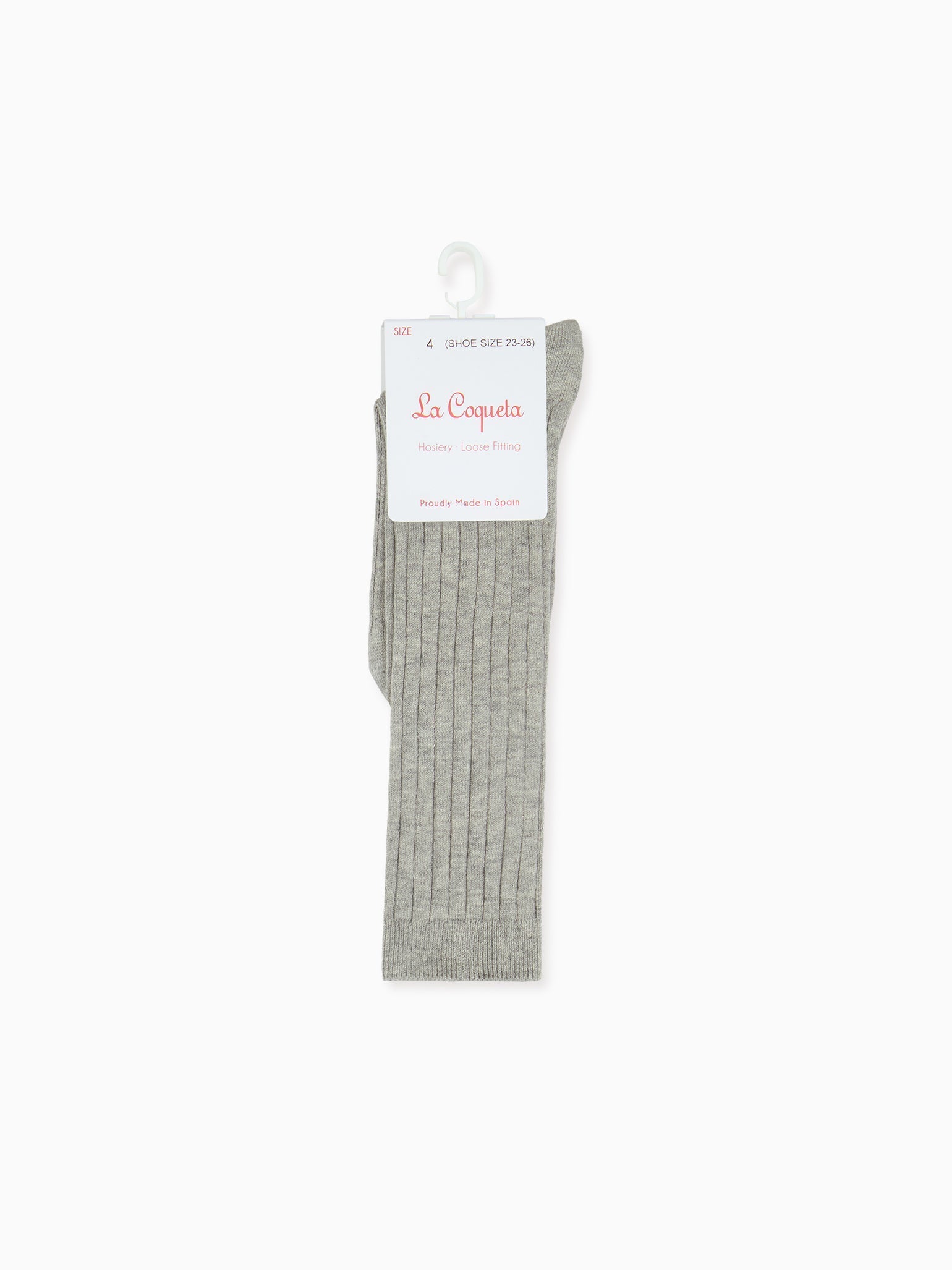 An essential to finish off any outfit, add that final La Coqueta touch with our gorgeous school-friendly Light Grey Ribbed Knee High Socks. Made from a super-soft cotton blend knit, these classic wardrobe staples have plenty of stretch for maximum comfort. Great come rain or shine, these traditional ribbed socks are perfect for any occasion. Available in Ribbed Tights and Ribbed Short Sock versions, ideal for matching sibling styles.