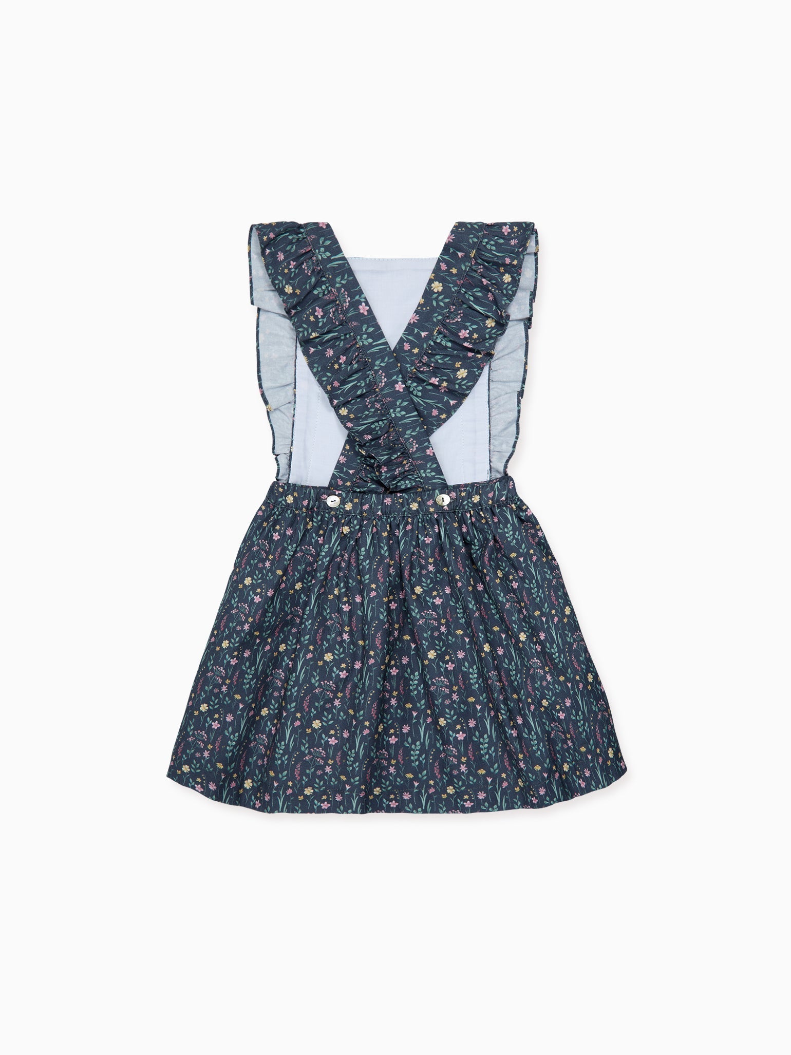 La Coqueta's Cora Girl Pinafore Skirt is a core wardrobe staple, designed in a traditional pinafore silhouette that guarantees plenty of wear all year long. Key features include the apron-style top and a floaty skirt crafted from pure cotton that holds its shape throughout the day, fully lined with soft cotton for added comfort. Rendered in a classic shade of navy blue, it is decorated with vintage botanical illustrations and delicate floral motifs in soft pink and green hues. It'll provide your little girl with countless ways to wear whatever the occasion, and can effortlessly be dressed up or down. It has a comfortable and secure elasticated waistband, fastened with mother of pearl buttons at the back, and butterfly frills cascading down the shoulders to add a touch of volume in true La Coqueta style. Coordinate with a little sister wearing the Felicita Baby Girl Romper for those adorable, perfect-picture moments.
