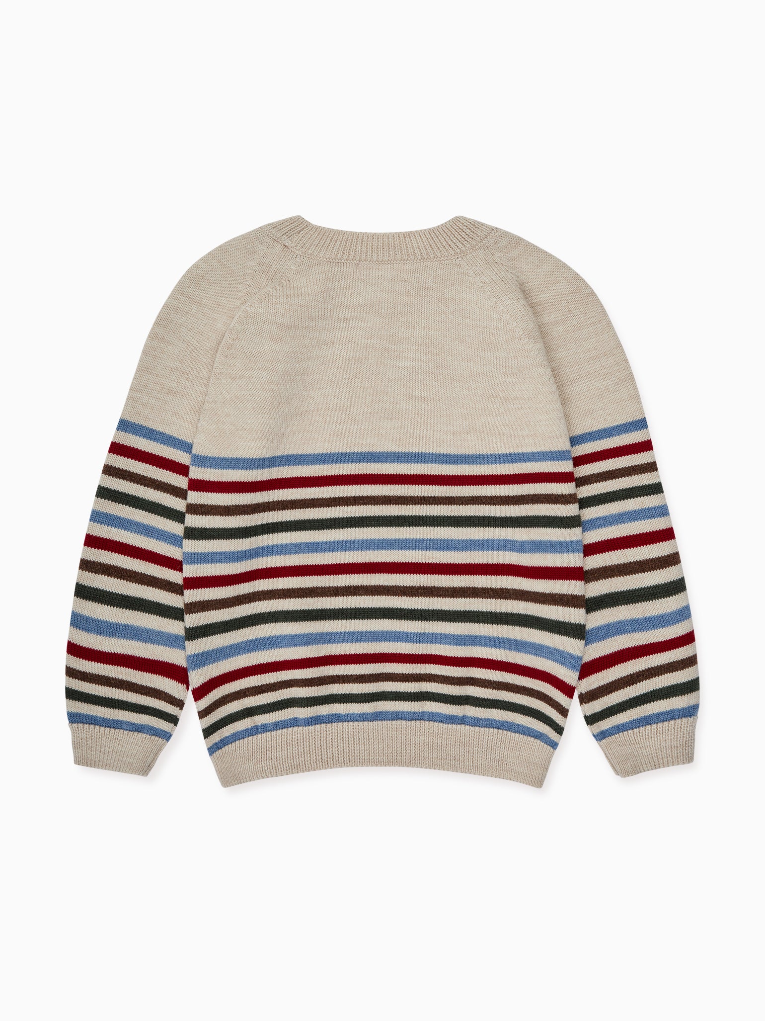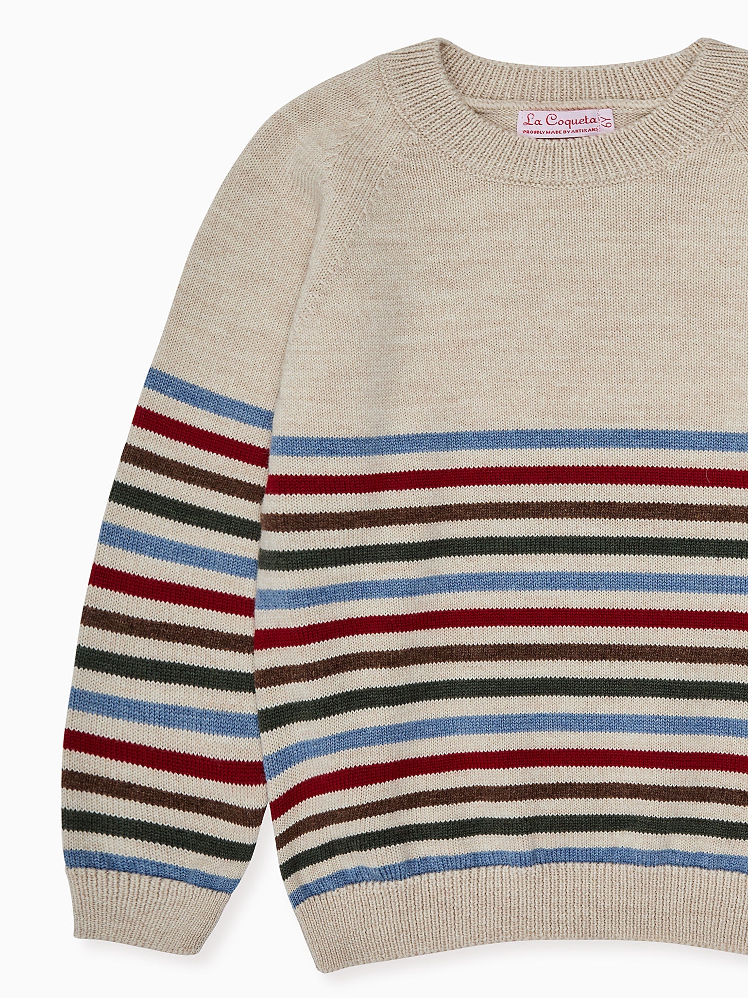 An essential element of any transitional wardrobe, La Coqueta's Curro Merino Boy Jumper adds a refined layer of collegiate charm to any wardrobe. Expertly crafted in Spain at our family-owned ateliers, it's made from pure Merino wool with a fine gauge that has the softest handle and is kind to even the most delicate skin. Long raglan sleeves and ribbed trims offer ease of movement and a flattering fit, with its lightweight yet cosy silhouette that is sure to be a versatile staple in your son's wardrobe, perfect for those unpredictable in-between days and dependable through the colder months. It's decorated with intarsia stripes in shades of burgundy, blue, brown and green, and layers perfectly over one of La Coqueta's crisp cotton shirts for extra warmth, or as is with classic chinos or trousers for elevated weekend-friendly wear.