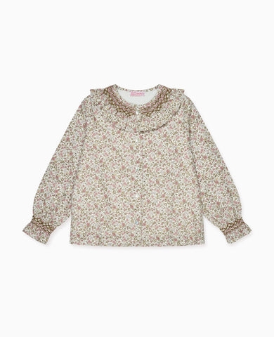 Celia Muñoz and the La Coqueta team design timeless staples that blend comfort, function, and elegance, keeping little ones stylish and comfortable, whatever the weather or occasion. The Lila Long Sleeve Baby Girl Shirt exemplifies this commitment, expertly tailored from pure cotton, renowned for its lightweight, breathable properties and gentle touch on delicate skin. It features a relaxed, boxy silhouette with long blouson sleeves, adorned with a delicate retro floral print in tones of soft pink and brown on an ivory base. Completing its feminine charm is the mother of pearl button placket, gathered cuffs for a voluminous finish, and a delicately pleated frill collar traced with French lace finishes. Coordinate with a big sister wearing the Emanuela Long Sleeve Hand-Smocked Girl Shirt for those adorable, perfect-picture moments.