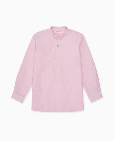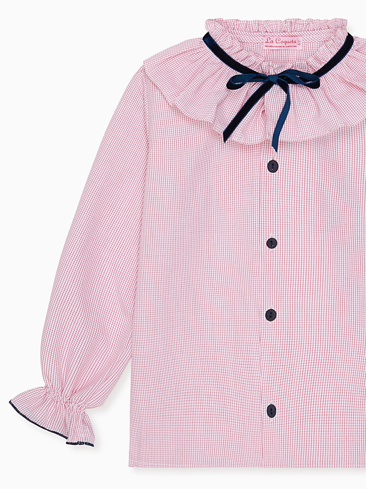 La Coqueta is dedicated to crafting reliable wardrobe essentials for your little girl, ensuring they get plenty of wear all year long. Staple pieces like the Felixa Girl Long Sleeve Shirt are guaranteed to be on high rotation, with its weekend-friendly appeal that can be dressed up or down depending on the event or occasion. This girl's shirt is expertly cut from cotton poplin, known for its lightweight, breathable qualities and gentle touch on delicate skin. It boasts a relaxed boxy shape with blouson sleeves gathered at the cuff and a charming frill peasant collar. It features a button placket down the front and is decorated with a charming red check print and a self-tie navy velvet bow at the neckline.