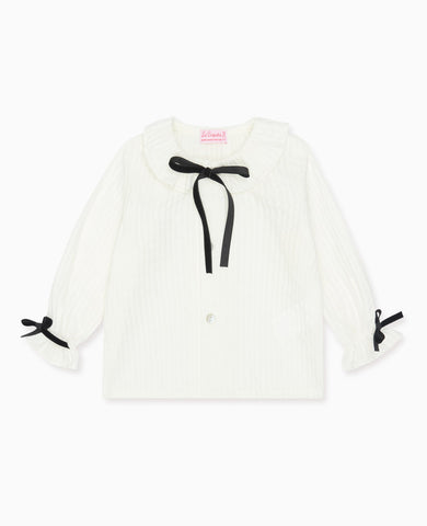 La Coqueta's Betty Long Sleeve Girl Shirt has become an icon in recent years, effortlessly elevating your little girl's wardrobe with its endless style possibilities and year-round appeal. This stunning ivory button-up blouse is crafted in Spain from pure woven cotton and has a relaxed, floaty fit, with a mother of pearl placket, and long blouson sleeves that are gathered at the cuff and traced with black velvet bow details for that final La Coqueta touch. The elegant Peter Pan collar has a feminine frill edge and a self-tie bow in black cotton velvet at the neckline to finish. Perfect for dressing up or down depending on the occasion, it's also school-friendly and can be styled for everyday wear. Coordinate with a baby sister in the Betty Long Sleeve Baby Girl Shirt for those adorable, picture-perfect moments.