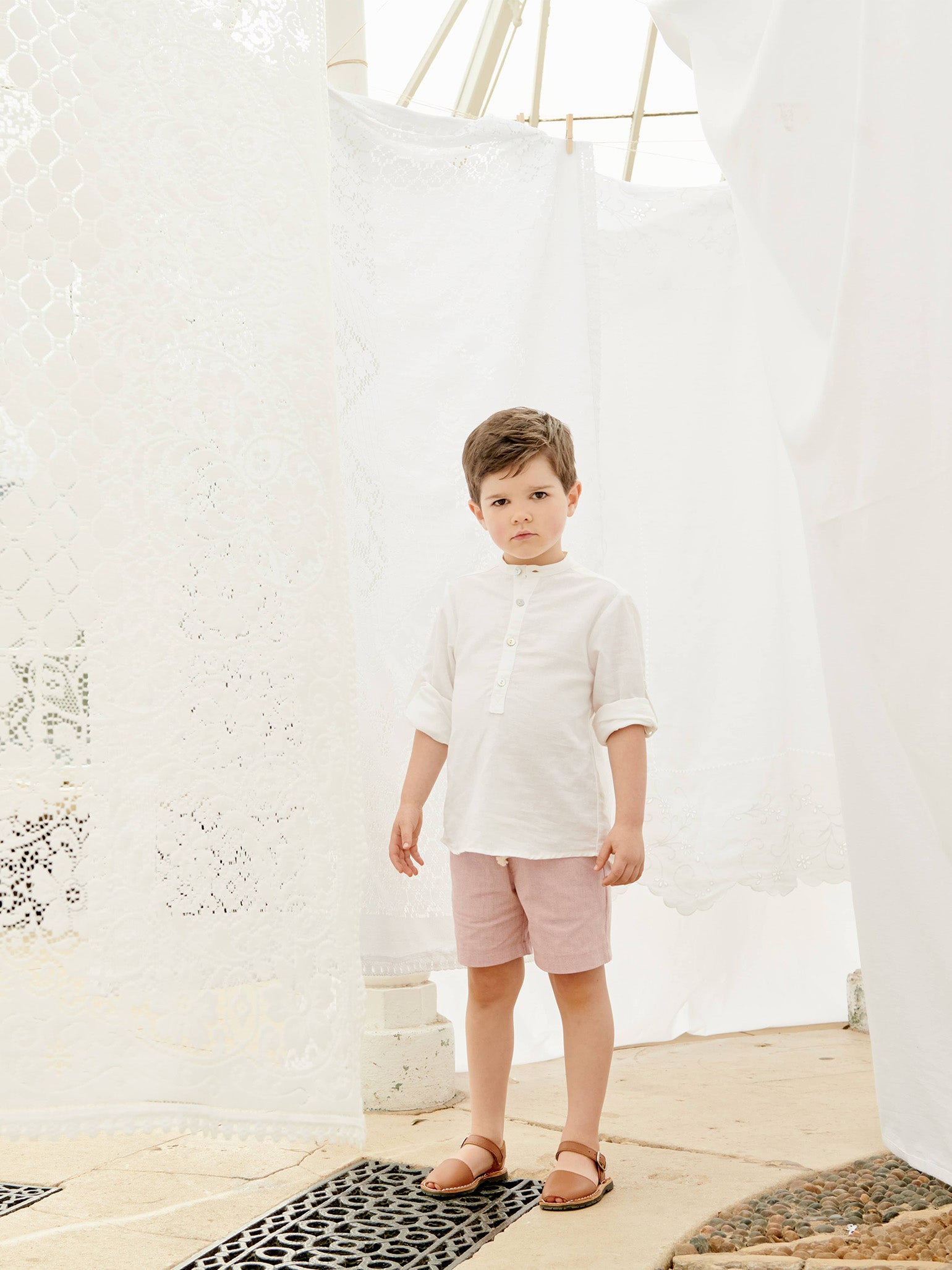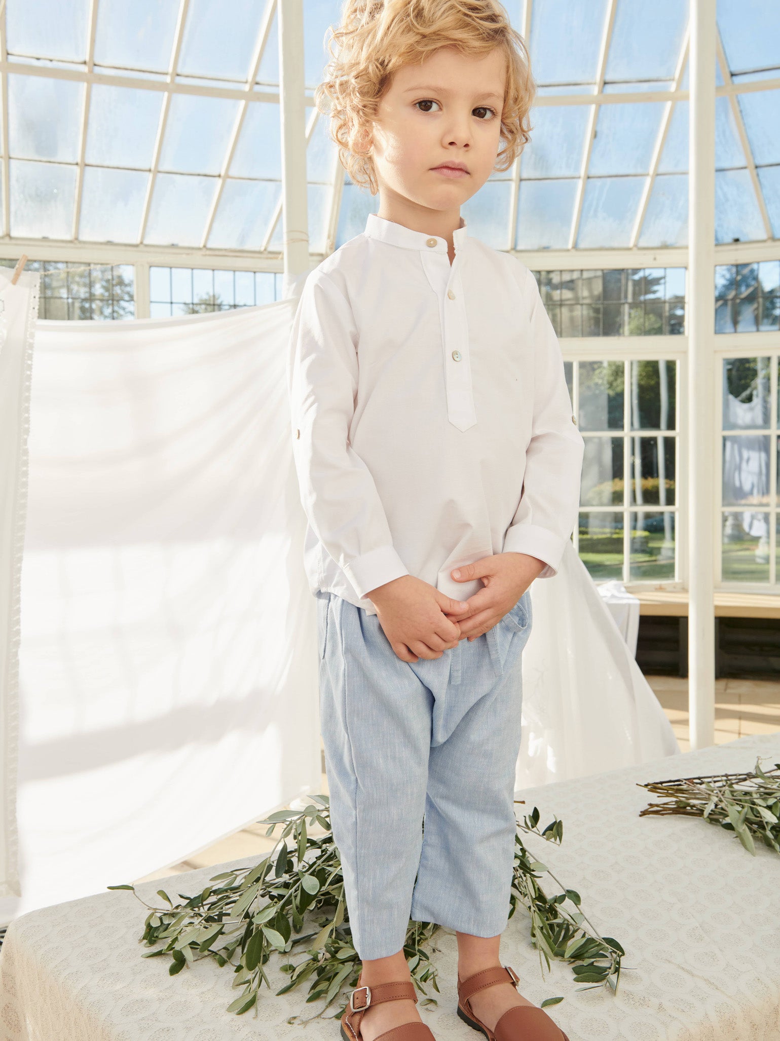 A versatile styling piece for year-round wear, the Jazmin Boy Shirt in crisp white is your new wardrobe best friend. A stunning 100% cotton shirt in a classic cut, this timeless design will take your little boy from the playground to the party all year long. Long sleeves and sophisticated stand collar add the final touches to this simple yet stunning design, fastening with iridescent mother of pearl buttons.