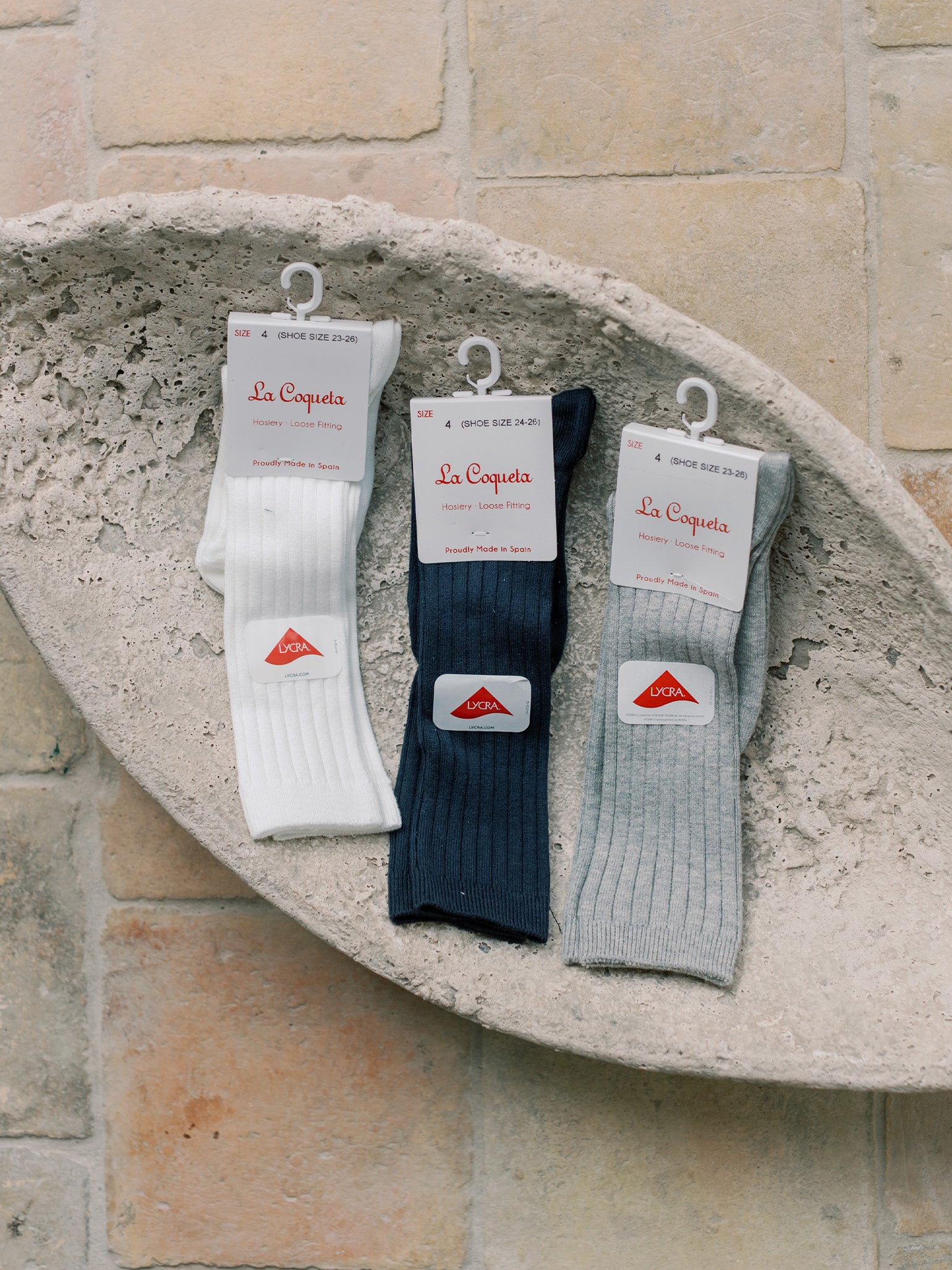 An essential to finish off any outfit, add that final La Coqueta touch with our gorgeous school-friendly White Mix Ribbed Knee High Socks Set. Made from a super-soft cotton blend, this trio of classic wardrobe staples have plenty of stretch for maximum comfort. Great come rain or shine, our traditional ribbed socks are perfect for any occasion. They come as a bundle of three pairs in navy blue, classic white and light grey, so you'll always have a spare on the go during the school week.